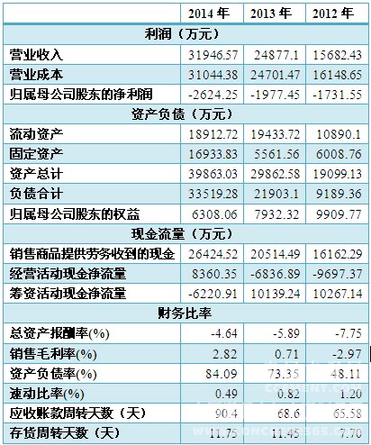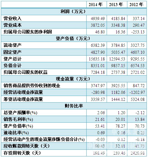 從各項財務(wù)指標的縱向?qū)Ρ葋砜矗?014年公司的盈利能力、資本結(jié)構(gòu)、償債能力及營運能力較2013年均有明顯好轉(zhuǎn),成長性可期。 中天管樁(832330.OC) 公司簡要介紹: 中天管樁成立于2007年,2007年底生產(chǎn)線投產(chǎn),2010年蕪湖第二條生產(chǎn)線建成投產(chǎn),2012年10月與偉星集團正式合作,2013年江蘇楊泰公司動工,2014年8月江蘇楊泰公司第一條全自動化生產(chǎn)線投產(chǎn)。2014年底完成股份制改革,2015年4月16日成功掛牌新三板。 公司控股股東為安徽偉星置業(yè)有限公司(由中國偉星集團、浙江偉星房地產(chǎn)開發(fā)有限公司共同投資組建),持股比例為40%,為公司實際控制人;公司董事監(jiān)事及高級管理人員持股31.8%。董事會7名成員中包括董事長在內(nèi)的4名成員曾就職于安徽偉星置業(yè),1名(總經(jīng)理)曾任建華管樁集團副總裁。偉星集團培養(yǎng)了兩個中小板上市公司--偉星股份和偉星新材,中天管樁新三板成功上市,可以大膽預(yù)測未來如果能夠成功跳入主板,將成為偉星集團旗下第三家上市公司。 公司財務(wù)狀況: 2014年公司由于新生產(chǎn)線的投產(chǎn),銷售收入大幅增長,但由于成本過高,歸屬母公司股東的凈利潤仍呈虧損狀態(tài)。截止到2014年底,公司流動負債高于流動資產(chǎn),短期償債風(fēng)險較高。