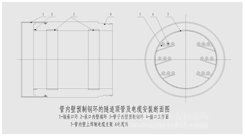 下圖就是預(yù)埋帶孔環(huán)形鋼板的隧道管節(jié)圖和安裝電纜的截面圖。