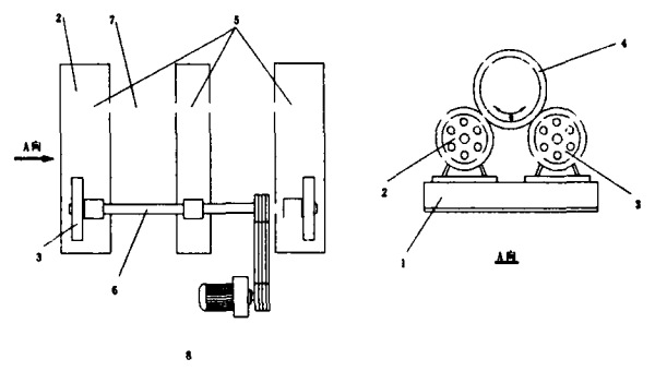 一、半圓形水泥管成型機的研制 1.1 生產(chǎn)工藝原理 與普通離心水泥制品成型的不同點就是在離心過程中增加了振動環(huán)節(jié)。按照約定,產(chǎn)品必須滿足一定的抗?jié)B要求,而普通離心工藝無法滿足該水泥管混凝土的密實度要求。因此,研制時在離心過程中增加了振動工序,對正在高速旋轉(zhuǎn)的水泥管模具及模具內(nèi)混凝土施加高頻振動,使混合料中的碎石、砂、水泥和水得到一定的合理分布,提高混凝土的密實度。振動裝置是在水泥制管機一側(cè)安裝四個帶有刻槽的油壓振動輪,分布于水泥管的兩端和中間部位,在液壓油缸的推動下與水泥管模具跑輪接觸產(chǎn)生振動力,實現(xiàn)離心振動。同時振動時四個振動輪可同時開啟也可分別振動,在分料時隨著布料進(jìn)度而分別開啟相應(yīng)位置的振動輪,中速振動時,可全部開啟振動;并可根據(jù)管徑的大小,采取不同的振動時間。振動時間通過操作控制臺來實施控制。 1.2 半圓形水泥管成型機的主要設(shè)備 半圓形預(yù)應(yīng)力水泥管成型機包括以下幾個部分:①高頻振動離心機;②水泥管模具;③鋼筋加工設(shè)備;④混凝土攪拌站;⑤混凝土布料機;⑥蒸汽養(yǎng)護(hù)系統(tǒng)。 1.2.1 離心系統(tǒng) 離心系統(tǒng)包括離心電機、托輪及托架兩個部分。離心機采用的支承方法為托輪式,依靠磨擦力帶動模具跑輪旋轉(zhuǎn)。振動系統(tǒng)包括托架、液壓油缸、振動輪幾個部分(附圖)。 ![]() 附圖 雙托輪式離心機組型式 1、底座;2、被動托輪;3、主動托輪;4、鋼模板;5、軸承座;6、主動軸;7、被動軸;8、調(diào)速電機; 1.2.2 離心振動工藝中的離心速度 在振動離心成型中,所要控制的工藝技術(shù)參數(shù)主要是離心速度與離心時間的問題。包括低速振動布料、中速振動成型和高速離心密實排漿3個工序。對應(yīng)的離心速度分為低速、中速、高速,3個階段應(yīng)計算出相應(yīng)的轉(zhuǎn)速和控制時間。 低速布料時,水泥管模具轉(zhuǎn)動速度控制在120r/min左右,對應(yīng)的電機轉(zhuǎn)速為150r/min。布料時間隨水泥管型號不同所需混凝土量而變化,一般控制在5~20min。采用低速布料是易于觀察縱向及四周方向布料的均勻程度,達(dá)到初步成型的目的。 中速離心成型與振動時的水泥管模具轉(zhuǎn)速一般控制在250~350r/min,不同型號的水泥管通過控制模具的線速度來實現(xiàn)混凝土相應(yīng)的離心力和振動力。此階段的時間控制在1~4min。采用振動布料方法,可加快布料速度,同時解決布料不均勻的缺陷。 高速離心轉(zhuǎn)速一般控制在520r/min,對應(yīng)的電機轉(zhuǎn)速為650r/min。此階段的時間為5~15min。高速離心的目的是為了達(dá)到密實、排漿,析出多余流離水和增加內(nèi)壁光潔度的目的。 研制完成后的振動離心機主要技術(shù)參數(shù)見表1。