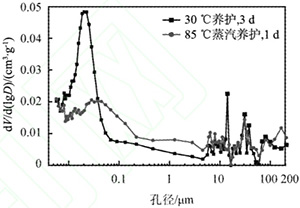 采用FEI Quanta FEG 250型掃描電子顯微鐿(SEM)觀察不同養(yǎng)護制度下水泥石的微觀結(jié)構(gòu),同時取對應(yīng)試樣,采用Pore Master 60GT型全自動壓汞儀進行孔結(jié)構(gòu)分析,孔徑分析范圍為0.35nm~950um,將得到的數(shù)據(jù)作圖,分析無害孔、少害孔、有害孔及多害孔的生成情況,從孔徑分布和孔隙率的角度分析影響混凝土強度和耐久性的因素。